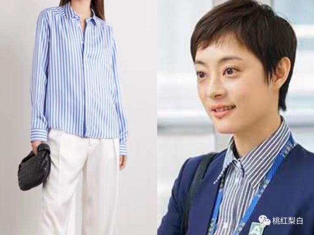 比如Gabriela Hearst的外套和裤装,已经足够正式统一了,那么内搭上就尽量选择稍微出挑有设计感一点的单品,Jil Sander的蓝色条纹衬衫就是不错的选择。 很好的平衡了大面积深色带来的压抑感,价格上也很符合房似锦的店长身份,不是高奢大牌也不是便宜大路货。
