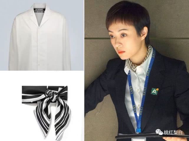 如果一定要穿这种“黑白配”的传统职业套装look,也可以学房似锦这样,用一条丝巾化解过于脸谱化的无聊感。 只是简单在Jacquemus的衬衫领子里,塞系一条Rag&Bone的几何图案丝巾,时髦造型感立刻就有了,乍一看还以为是衬衫本身的时尚小设计。