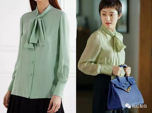 相应的,这种“内搭撑起半边天”组合模式还有很多。 Valentino的薄荷绿系带领结衬衫,从款式到颜色都是职场内搭首选。 配在外套里或者直接单穿都很成立,比起普通的纽扣款,视觉上看起来女人味更足。