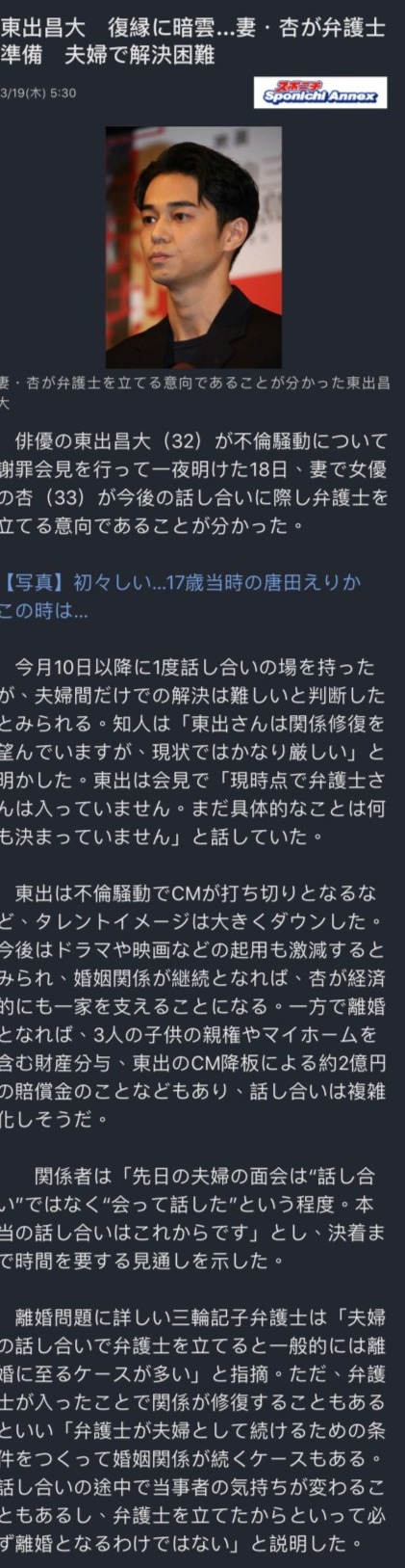 3月19日,据日媒报道,渡边杏准备聘请律师以解决与东出昌大之间的婚姻问题,有知情人透露,东出昌大想要修复与杏的关系,但目前看来很难。