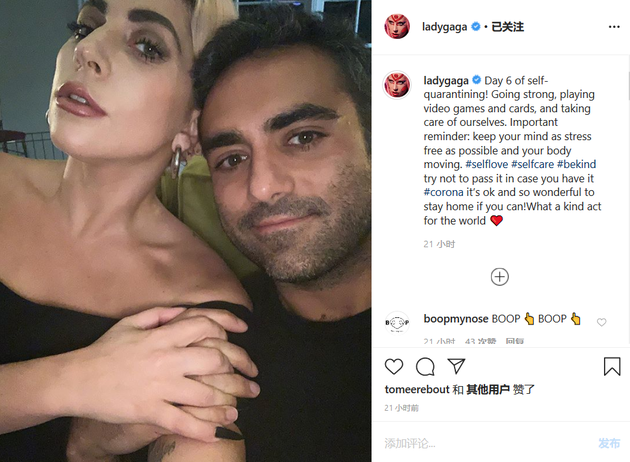 3月18日,Lady Gaga自我隔离的第六天,她在个人社交网站晒出与男友的合照,并嘱咐大家要自爱、自我护理、与人友善。