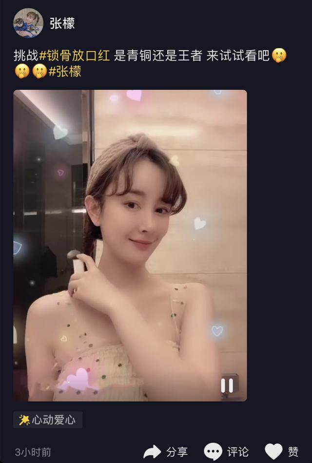 3月18日晚,张檬在社交平台上晒出动态,挑战“锁骨放口红”挑战,心情不错。