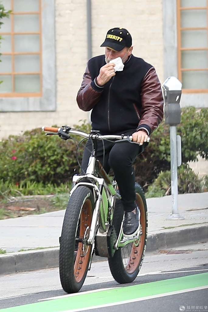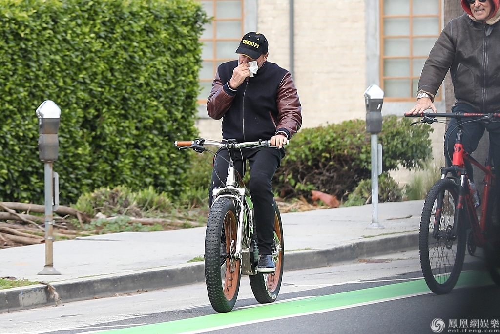 施瓦辛格戴棒球帽穿皮衣,看上去依旧硬汉十足,边骑车边擦鼻涕似感冒。