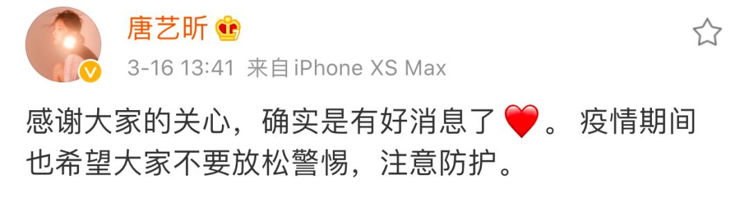 16日,唐艺昕在微博官宣怀孕喜讯,“感谢大家的关心,确实是有好消息了”,随后张若昀也转发了该条微博表示感谢关心。