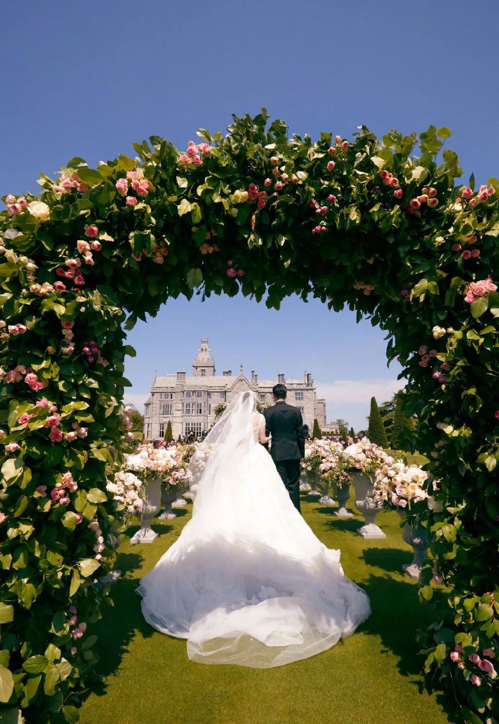 爱尔兰最美的城堡阿代尔庄园中,张先生化身童话中的王子骑着白马进入婚礼现场,唐艺昕挽着爸爸的手身着洁白婚纱缓缓步入殿堂。