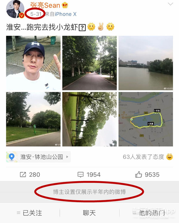 现在已经被他设置成“仅半年可见”了,最早一条是2019年5月31日的。