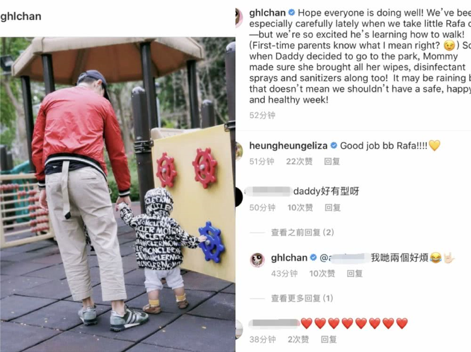 3月18日,郑嘉颖老婆陈凯琳分享父子动态,13个月的儿子郑承悦学会走路