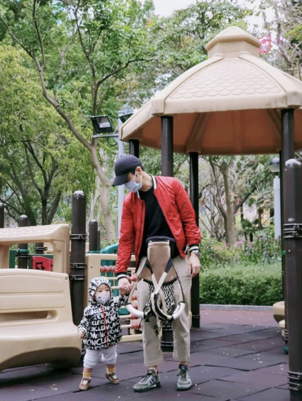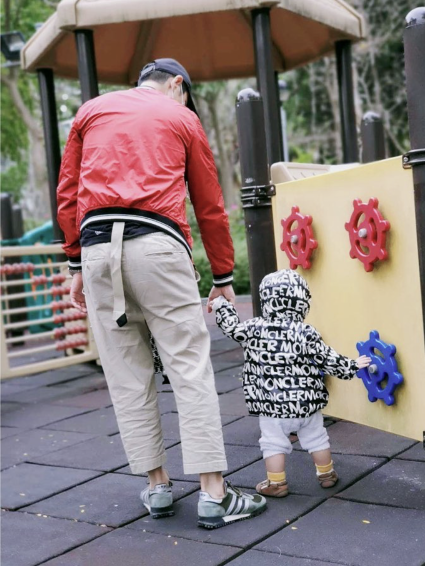 郑嘉颖牵儿子手逛公园,小承悦已学会走路。
