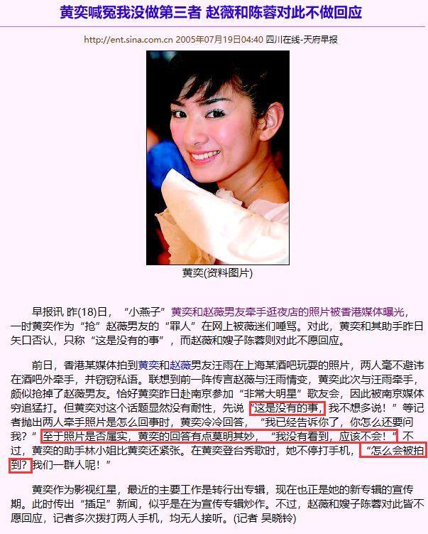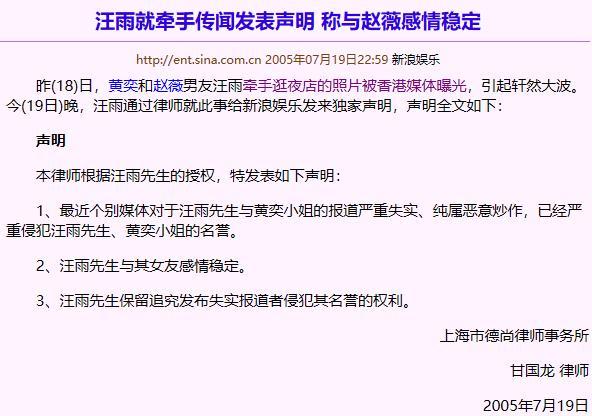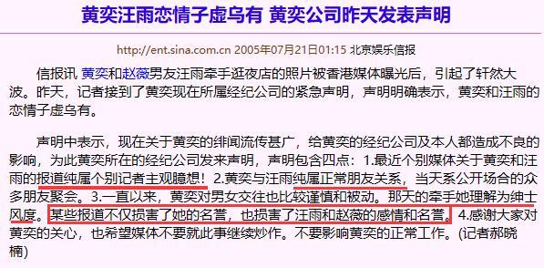 Anyway,两份声明之后,赵薇和汪雨的恋情杀青,黄奕也没有成为下一任女主,成了标准的“燕纷飞”。