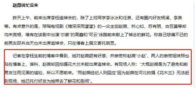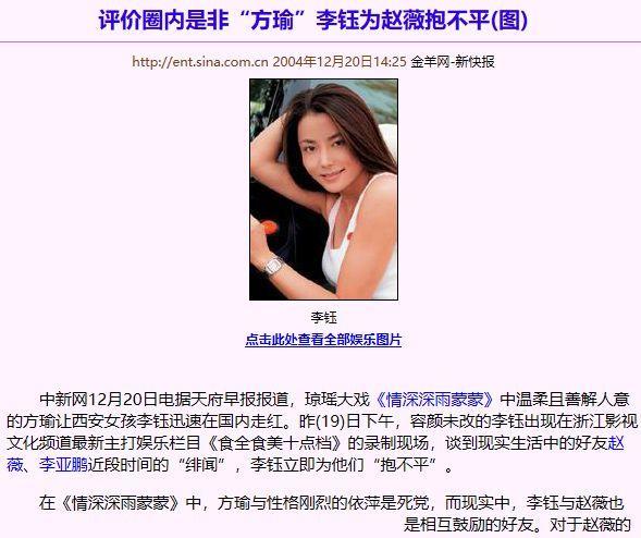 当年在《情深深》剧中,李钰扮演的方瑜是赵薇扮演的依萍的好闺蜜,戏外两人关系也不错,赵薇身陷是非时,李钰曾发声力挺。只是这篇报道在言语表达上有些乌龙,当时赵薇还有段绯闻是和运动员王励勤,而李亚鹏则已经忙着和赵薇闺蜜王菲聚会。