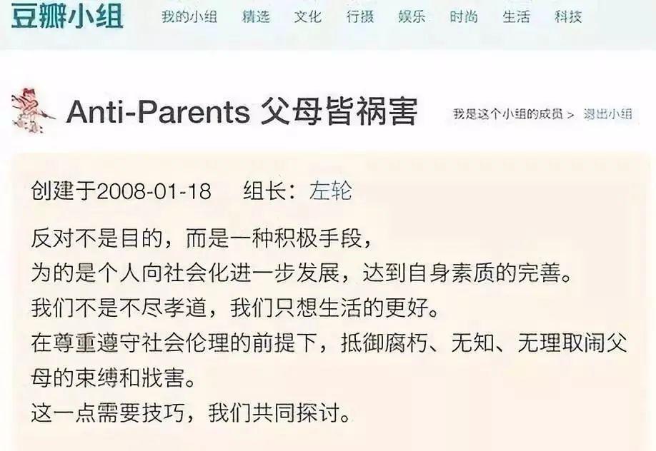 曾引发争议的豆瓣小组“父母皆祸害”也许是80、90后原生家庭问题的折射 来源:豆瓣