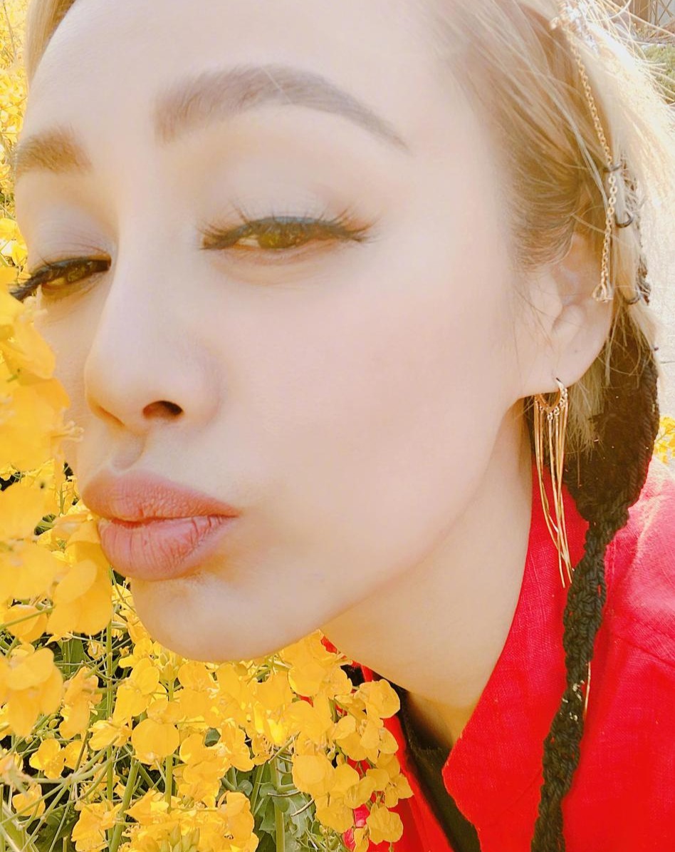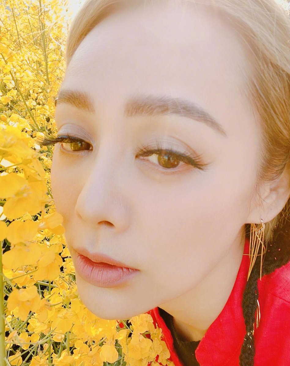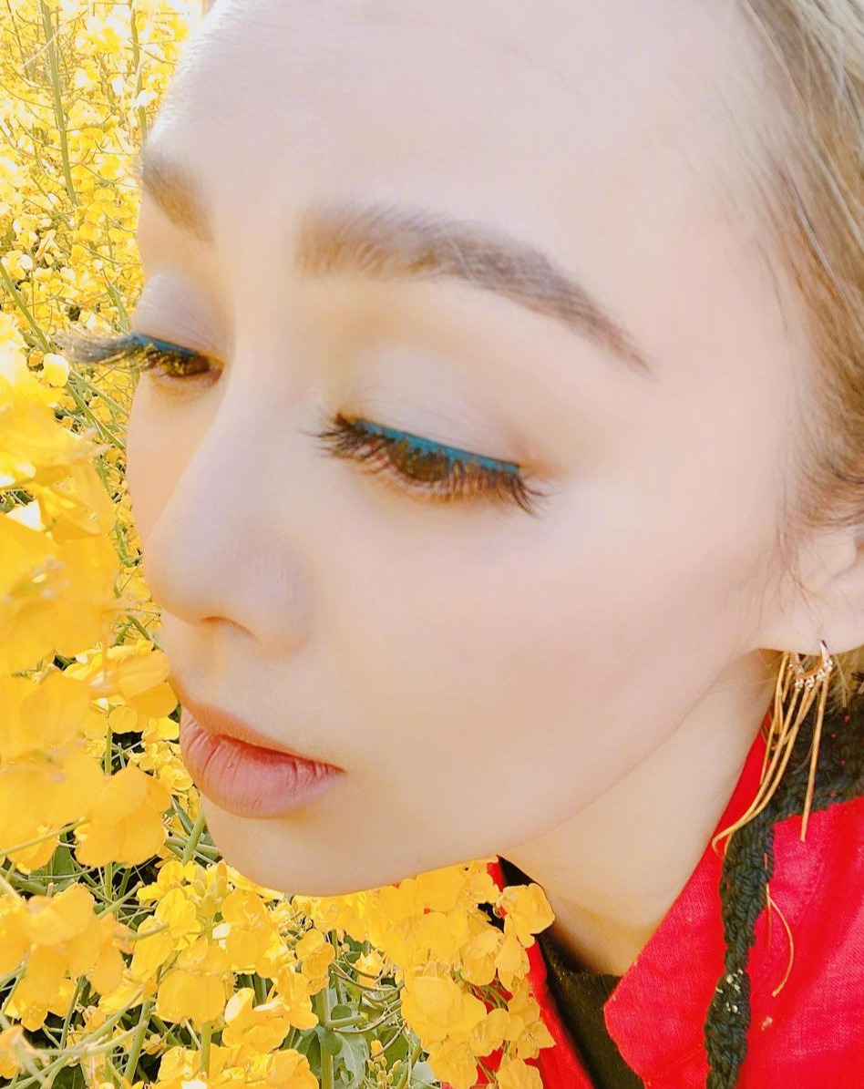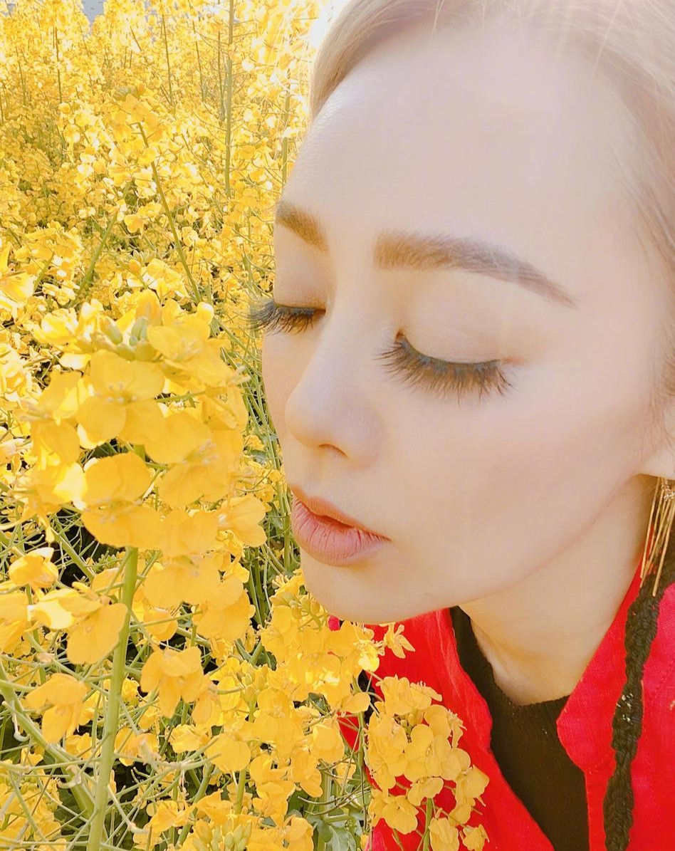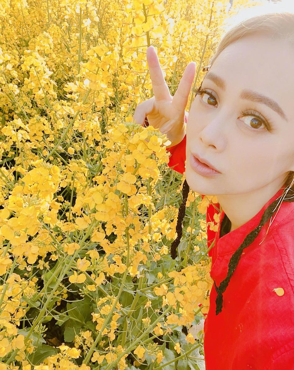照片中,宁静穿着红色上衣与黄色的油菜花自拍,色彩浓烈,很春天,浓密的长睫毛让她电力十足。