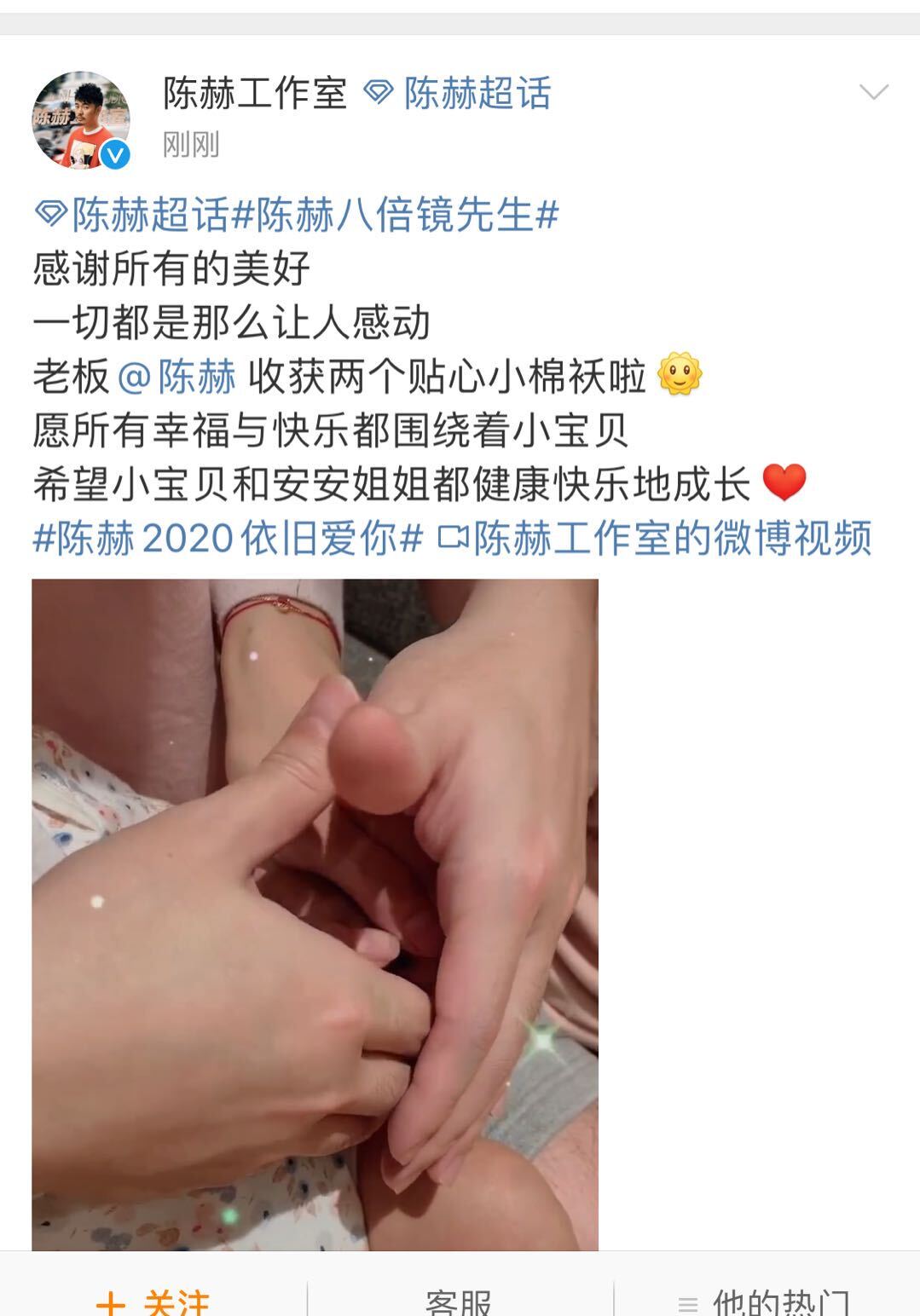 3月17日,陈赫在社交平台上晒出一段视频,视频中,陈赫一家四口把手合在一起,然后绽放出了一朵花苞的造型,小宝宝的手就放在一家人的最中间,被爸爸妈妈和姐姐保护着,超有安全感。陈赫也可爱称呼小宝宝:“可爱的小东东~”