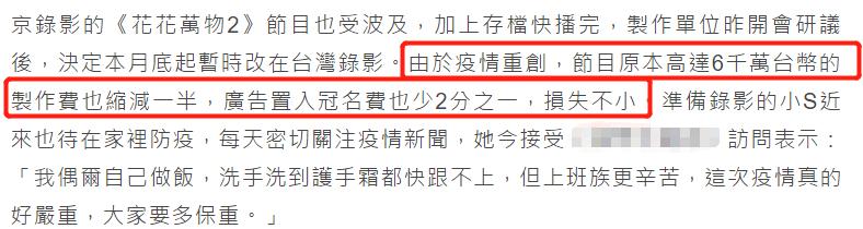 而且由于疫情重创,节目原本高达6千万台币(约1390万人民币)的制作费也缩减一半,广告植入冠名费也少了二分之一,损失不小。