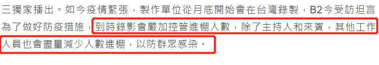 制作人B2受访时透露,为了做好防疫措施,到时候录影会严加控管进棚人数,除了主持人和来宾,其他工作人员也会尽量减少,以防有意外发生。
