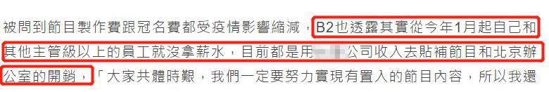 被问到节目制作费和都受到影响缩减,B2坦言,其实从今年1月起自己和其他主管级以上的员工就没拿薪水,目前都是用公司收入去补贴节目和办公室的开销:“大家共克时艰,我们一定要实现有植入的节目内容,所以我还在想办法。”