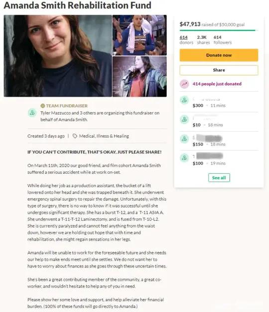 “她真的只是坐在那里,铲斗就落在她身上,”阿曼达的同事马祖科告诉媒体。上周五,为了帮助阿曼达·史密斯恢复健康,她的好友兼同事在网上为她发起了众筹。页面上对阿曼达·史密斯的事故进行了说明,并表示:她在接受手术后,还需要进行大量的后续治疗。她目前瘫痪了,腰部以下没有任何感觉,但是我们一直希望,她能好起来,并恢复健康。