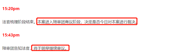 所以在法官梳理结束后,陪审团经过初步商议,并没有决定今日对案件进行裁决,而是告知法官,将会在明早继续审议。从这样的说法似乎可以看出,陪审团内部还存在分歧,并没有一方形成压倒性的观点。