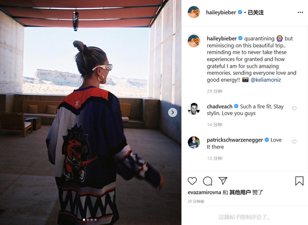 3月17日,海莉在个人社交网站晒出与比伯的背影照,透露与比伯正在隔离中,海莉发文写道:“在这场美丽的旅行中回忆。提醒我不要把这些经历视为理所当然,我很感激这些美好的回忆。给大家送去爱和美好的能量!”