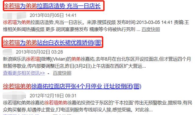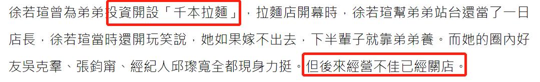 3月17日,根据台湾媒体的最新报道,徐若瑄弟弟的拉面店经营不善已经闭店,当年拉面店开幕时,徐妈妈作为董事长,徐若瑄则帮弟弟投资,还曾站台当了一日店长,徐若瑄当时还开玩笑说,她如果嫁不出去,下半辈子就靠弟弟
