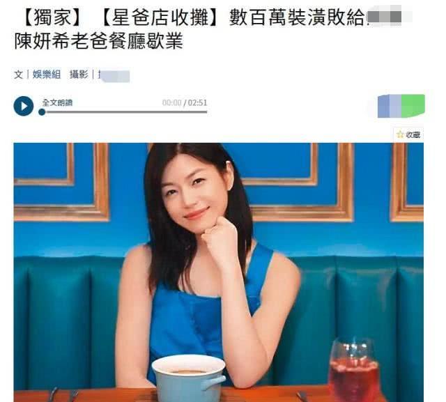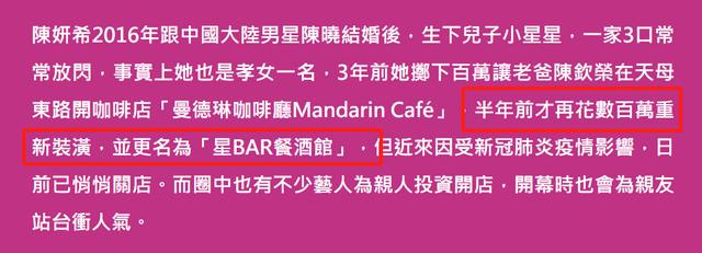 除了徐若瑄之外,不少圈内明星都为家人投资开店,就像孝女陈妍希,三年前也曾老爸陈钦荣在天母东路开咖啡店“曼德琳咖啡厅Mandarin Café”直到半年前才再花数百万重新装潢打水漂,日前也生意惨淡赔本关店。