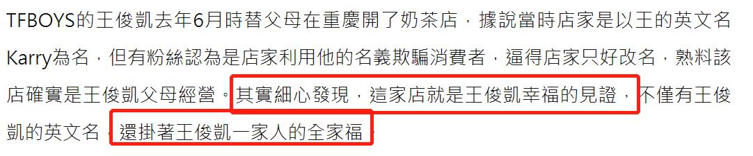 如今王俊凯也为爸妈在重新开了一家奶茶店,据说排队四小时竟然一杯难求,甚至有不少粉丝从外地赶过去只为喝一杯偶像店铺的奶茶,只不过开了三天就关了,据说是太过火爆人手不足的原因。