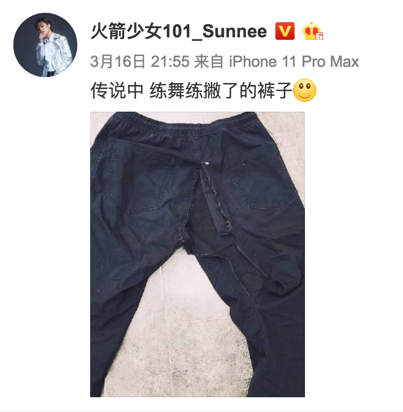 3月17日,火箭少女Sunnee晒出传说中练舞练撇了的裤子,随后粉丝们纷纷为其花式P图,“缝补”起了这条裤