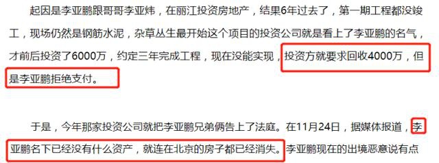 除此之外,此前有媒体爆出其身缠4000万债务,甚至被告上法庭,据报道,当时李亚鹏名下已经没有资产,甚至连房产都因此消失。