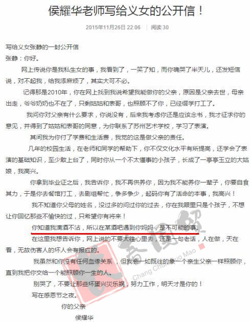 2015年11月,网上曾有爆料称侯耀华有一个19岁的私生女,随后侯耀华给该女孩写了一封公开信,他在信中说“你知道我滴酒不沾,所以在某酒吧遇到你妈妈,是不可能的事。”否认私生