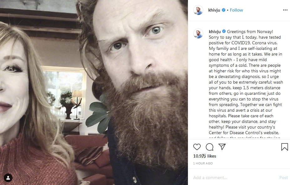 北京时间3月17日消息,据外媒,挪威演员克里斯托弗·海维尤(Kristofer Hivju)透露自己确诊感染新冠,正在家中隔离。