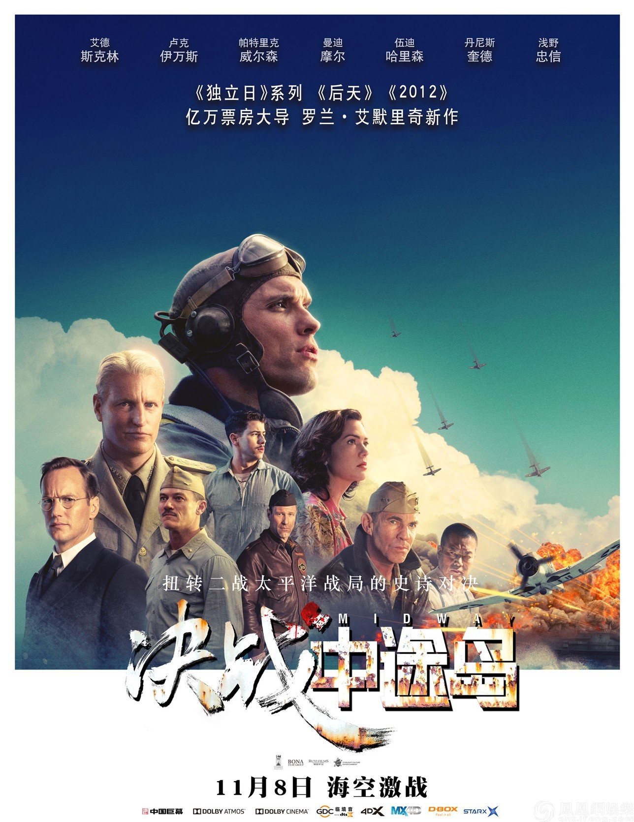 电影《决战中途岛》由好莱坞知名导演罗兰·艾默里奇执导,艾德·斯克林、卢克·伊万斯、帕特里克·威尔森、伍迪·哈里森主演,将以中国巨幕、杜比VISION、杜比全景声、DTSX临境音等多种版本与观众见面,正在全国热映中。