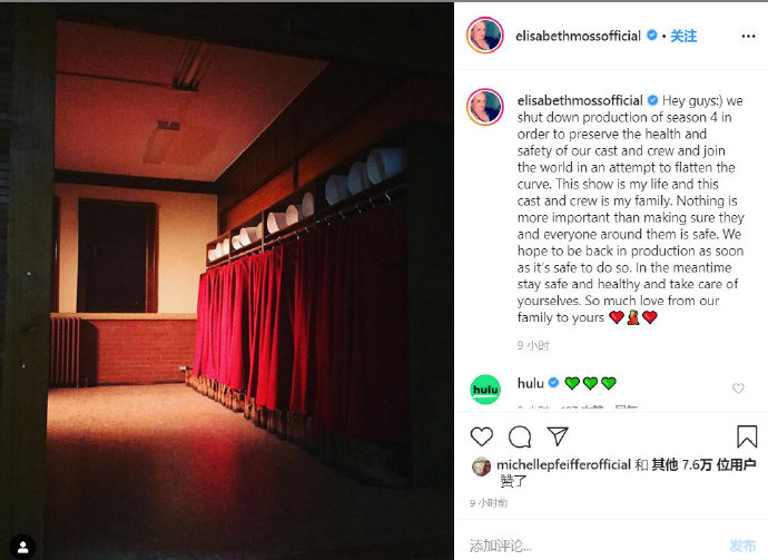 3月16日,伊丽莎白·莫斯在个人社交网站上发文宣布《使女的故事》第四季停拍。她写道,“这部剧是我的生命,卡司与剧组成员是我的家人,没有什么比确保他们以及他们周围人的安全更重要的了。同时,大家也要注意安全与健康,照顾好自己。”