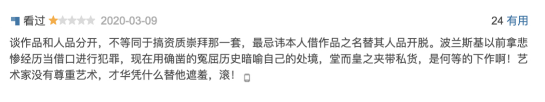 正因为如此,许多压根没有看过本片的网友涌进豆瓣刷起了一分差评(目前本片只在柏林电影节和部分展览上放映过)。