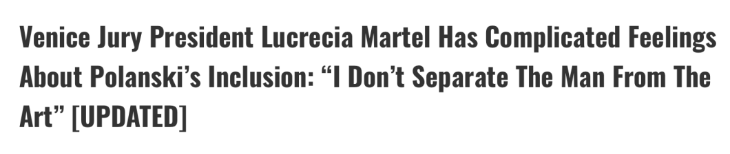 前有威尼斯电影节主席露柯希亚·马泰表示「不能区分那个男人和他的艺术」;