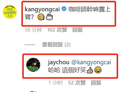 好友陈建州更是在评论区大方夸周董表示“粗哦”暗示周杰伦的手臂肌肉,周杰伦也心满意足的回应表示“水啦”!一向在社交网络不活跃的蔡康永也来凑热闹,表示:“咖啡师干嘛露手臂”一语道破周杰伦炫肌肉,周董还回复说“哈哈,这个好笑!”