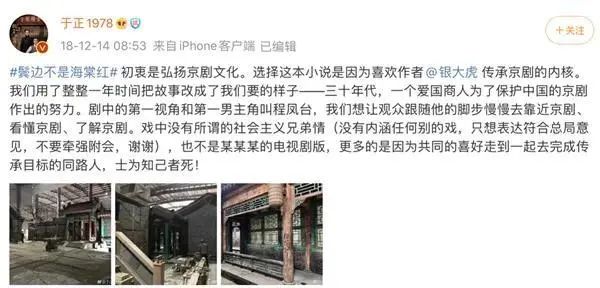 于是,他主动发微博强调,说《鬓边》想讲的只有两点:1、弘扬京剧文化,2、士为知己者死。仅用短短几句话,就撇清了本剧与耽美之间的关系,拔高了剧中的两大亮点。