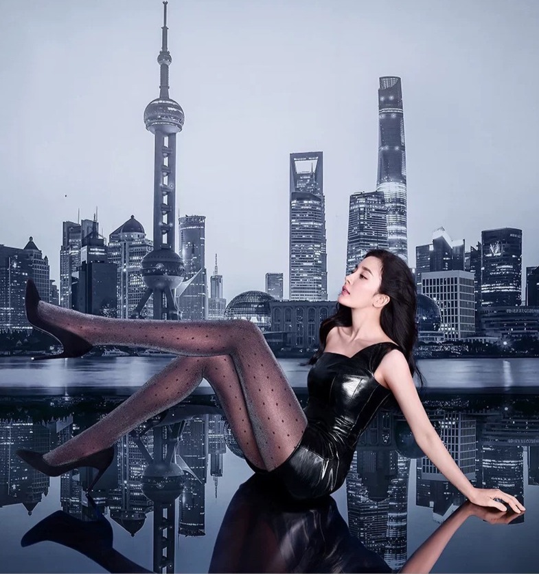 照片中的杨幂穿着黑色皮衣,黑色高跟鞋,打造出满满的现代感。