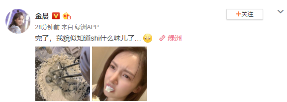 3月16日,金晨分享近照,并配文:“完了,我貌似知道shi什么味儿了…” 照片中金晨饶有兴致地用电动搅拌器制作奶酪,随后她亲自品尝,微微皱眉,表情十分尴尬。