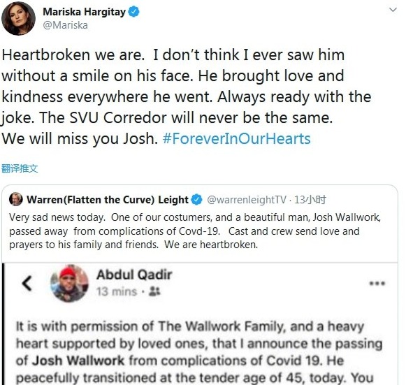 《特殊受害者》剧集运作人沃伦·莱特(Warren Leight)也在个人社交平台上证实了此消息,称非常悲痛:“我们的服装师之一、一个美丽的男人,Josh Wallwork,因为新冠并发症去世,演员和剧组工作人员为他的亲朋好友送去爱和祈祷,我们心碎了。”