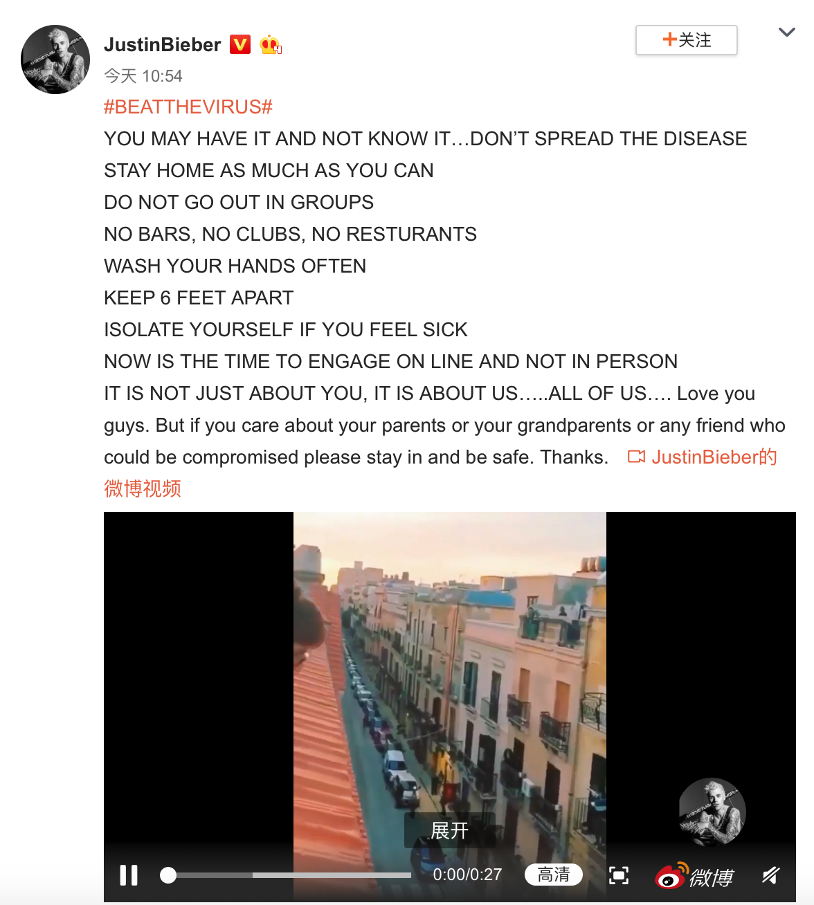 比伯在文中说道:“你可能生病了但你却没有察觉,不要传播疾病,尽可能在家中不外出。不要结伴出行。不去酒吧、俱乐部和餐厅。勤洗手。与人保持6英尺距离。如果感到不适请自我隔离。现在鼓励大家多在网上交流而不是面对面交流。这不仅关乎你自己,也关乎我们所有人。我爱你们。但是如果你们非常在乎父母长辈和朋友的安危,请呆在家里,注意安全。谢谢。”