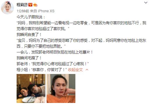 3月15日,程莉莎又在个人社交平台分享出一家三口宅家趣事,从程莉莎的分享中可以看到,为了能够坐在老婆最喜欢的地毯上吃零食,郭晓东也是学着十岁儿子撒娇,结果却遭老婆白眼被嫌弃了一番,家庭地位一目了然。