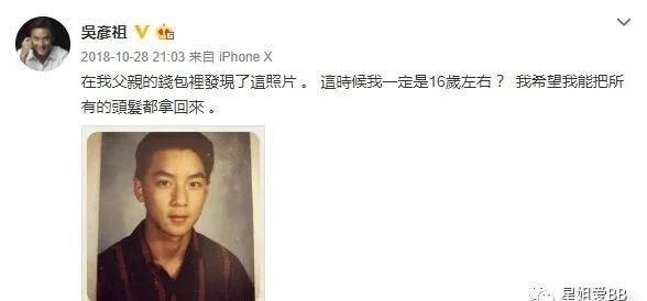 大帅哥放飞自我? 前两天,网上流传一张吴彦祖的合影。吴彦祖穿着黑色外套和浅色裤子,搭配蓝色围巾,气色hin不错。 不过,大帅哥的发际线似乎不是特别乐观。 微博热评都在说吴彦祖一如既往地帅气,果然是神颜。 还有网友惊呼:他怎么这么像苏大强了? 之前苏大强走红,有网友做了吴彦祖和苏大强的渐变图,大家发现原来他俩的距离,也就是去眼袋和磨皮的差距。 周杰伦不发专辑第1000天的时候,还有歌迷发文说自己从吴彦祖等成了苏大强,周杰伦本人还点了个赞。 后来甚至有网友给苏大强做了AI换脸,事实证明顶着这个发型,就算脸帅如吴彦祖也不是很OK。 当苏大强戴上帽子遮住发型立马变潮,直接撞脸吴彦祖。 说到吴彦祖,公认的帅哥届的标杆。意外的是,他是成年之后才长开,有网友找到他18岁毕业参加晚会的照片,觉得他当时平平无奇。 年轻的时候长得像释小龙和刘恺威。 也有可能是照片有点模糊,优越的五官看不太清的缘故,这些年来不少人一直在讨论,到底吴彦祖的颜值巅峰是《美少年之恋》还是《新警察故事》? 拍《美少年之恋》的时候他是23岁左右,给人的感觉是邻家品学兼优的学长,走的是清纯挂。 到了《新警察故事》饰演反派,邪魅一笑气场很强大,是完全不一样的感觉。 顶级美貌让“平平无奇的恋爱小天才”萧亚轩念念不忘,上节目被问以往合作对象她最想念谁,答案是吴彦祖。 她还说拍摄的时候一直很害羞,害羞到笑场。 自己朋友连给他化妆的粉扑都留着。 被问到她的理想型,她就像小粉丝一样狂吹吴彦祖彩虹屁。 被问到娱乐圈最帅的男人是谁,答案依旧是吴彦祖。 作为十级颜控,合作过王力宏、梁朝伟、陈冠希、霍建华、贺军翔、言承旭、立威廉、凤小岳等帅哥,这么多年来萧亚轩心目中的颜值top始终不变。 可见吴彦祖是真的帅,外网的生图相当能打。 可惜岁月是把剃头刀,之前他曾po出自己16岁青涩旧照,感叹:“希望我能把所有的头发都拿回来。 ” 去年4月有网友偶遇吴彦祖,两人还合影了。吴彦祖身穿白色T恤搭配浅色牛仔裤,身材没的说,就是发际线略有后移,被大家吐槽撞脸苏大强。 5月的时候,吴彦祖向媒体透露自己在上个月差点死亡。他开始认为只是普通盲肠炎,延误了治疗,导致盲肠溃烂爆破。从病发到治疗,吴彦祖整整九天时间没有进食,暴瘦13斤。后来参加戛纳的活动也看得出状态不太好,让人心疼。 去年10月到商场参加活动,脸上开始长了些肉肉,看起来恢复得不错。 到了年底,吴彦祖晒出自己健身前后的对比照。阑尾炎出院后,他花了大把的时间来恢复体重并恢复体型。 帅气和健康不是平白无故来的,还是得靠自律。 就是躲不过命运安排的发际线倒退这个有点可惜。之前大家都说男明星的最终归宿都是赵本山。 同样是公认神颜的陈冠希喜提跟本山大叔的渐变图。 女明星最后的归宿则是蔡明老师。 哪怕年轻的时候一点也不像,上了年纪以后都会撞脸。 所以是男明星最终归宿除了赵本山现在又多了苏大强?大家觉得艺人们是坦然接受衰老还是想尽办法在脸上do something维持美貌比较好?