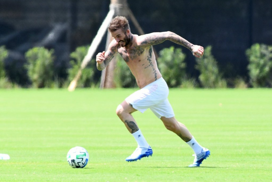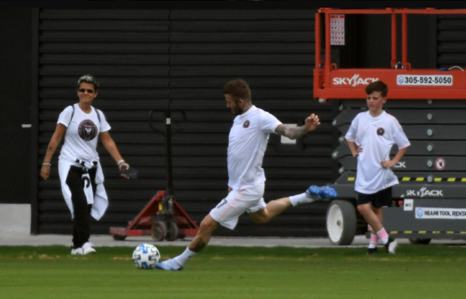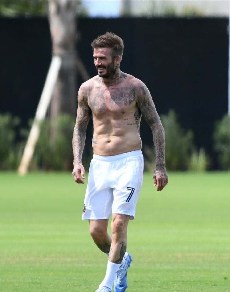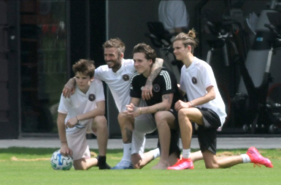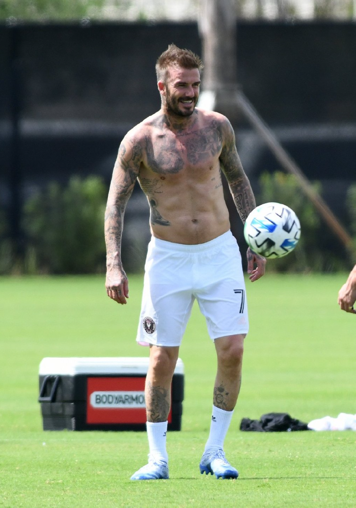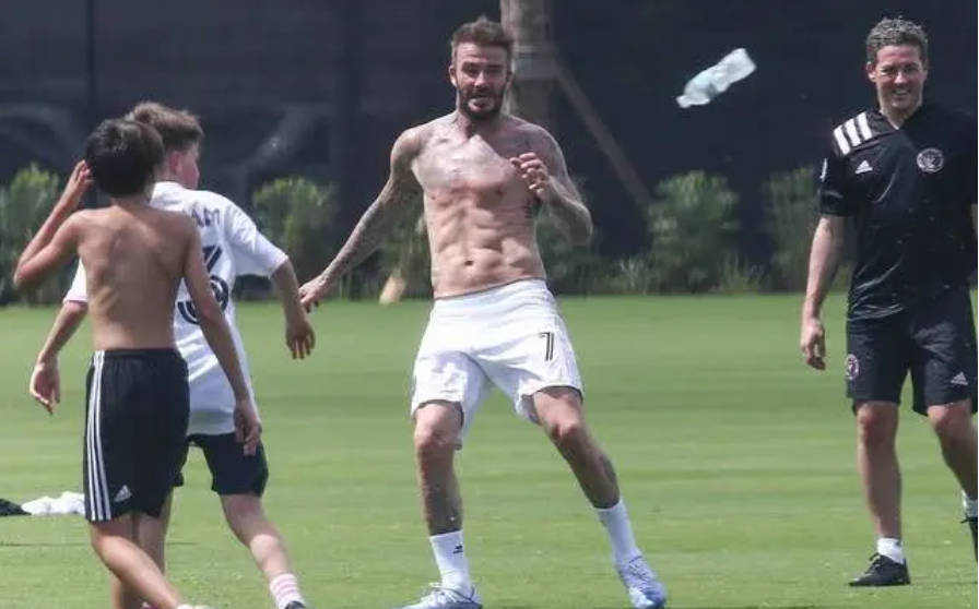 近日,大卫-贝克汉姆和儿子布鲁克林、罗密欧、克鲁兹现身迈阿密的球场踢球,贝克汉姆老当益壮,虽然快50岁了,依然有八块腹肌,不愧为最帅男