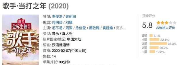 选手的中生代化、关注度的下降,都是《歌手》不如从前的客观因素,如今再失去了音乐最具感染力的现场,也就怪不得它在豆瓣的评分只有5.8。