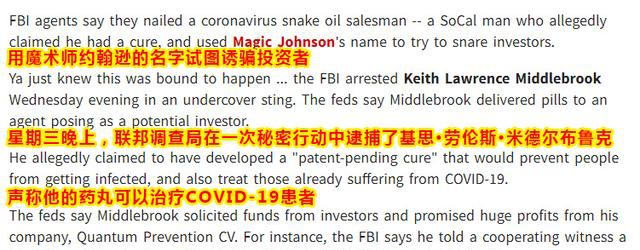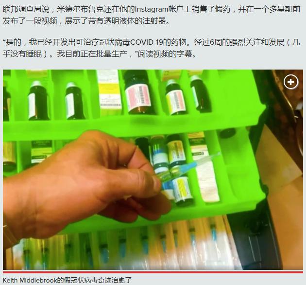 据悉,基思·米德尔布鲁克向病人推销药丸,声称具有治愈新冠肺炎的功能,他还表示自己已经治愈了一名叫Socal的男子,期间又还打着NBA魔术师埃尔文·约翰逊的名号,试图诱骗投资者,但埃尔文·约翰逊表示对此一无所知。