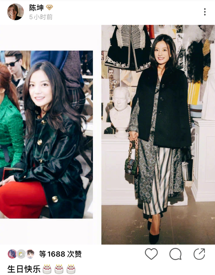 随后,陈坤还在另一社交软件上晒出两张赵薇的美照,再次为其庆生。