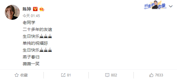 陈坤也发文称:“老同学二十多年的友谊,生日快乐。单纯的祝福妳,生日快乐,燕子春归,薇薇一笑。 ”尽显20多年同窗情。