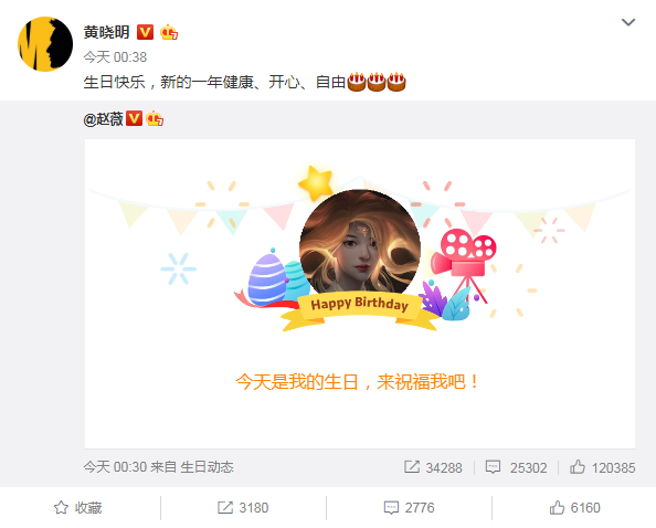 黄晓明发文称:“生日快乐,新的一年健康、开心、自由。”