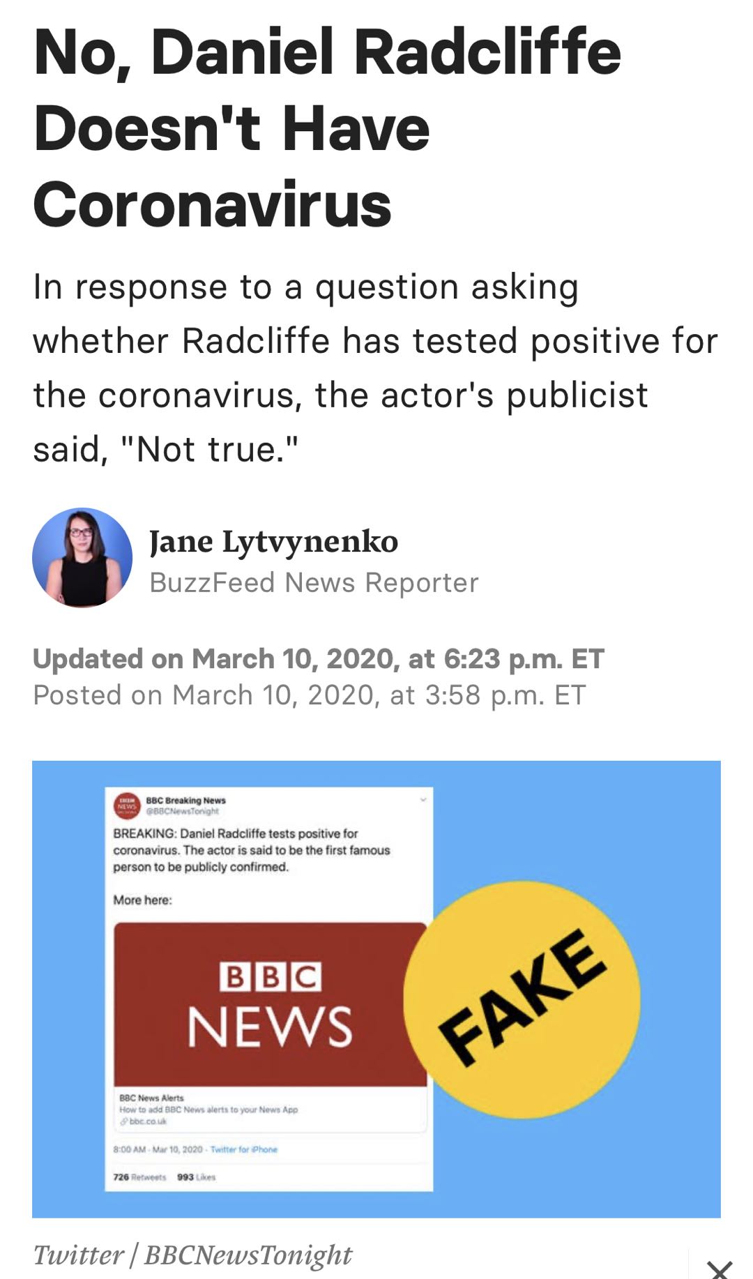 一个名为《BBC Breaking News》的帐号在日前PO出“新闻”,声称丹尼尔·雷德克里夫确诊新冠肺炎,“这位演员是第一个被公开证实(感染)的名人。”虽然这个帐号只有100多位追踪者,但这则“新闻”在几小时内就被转发了700多次,还有超过1000人点赞,引起关注。
