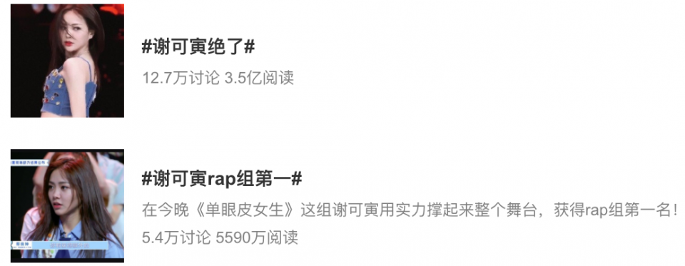 当晚,直男社区虎扑步行街上,针对谢可寅的演唱表演的相关话题接二连三,掀起讨论热潮。#青春有你谢可寅这段什么水平?#,#今晚这场吹爆谢可寅,我先Pick了#,#谢可寅就是国内女团rapper第一#等等话题,一晚累计吸引了30多万虎扑网友阅读。虽无法与微博饭圈女孩相比,却也近乎是《青春有你2》最具热度的话题之一。